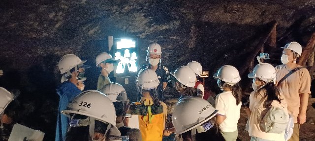 コウモリ穴の中は、外の空気との差が大きく非常に涼しいです。理科の教員から、コウモリ穴のでき方や、縄状溶岩などの様子を見ながら、溶岩がどのように流れたかを説明を受けました。