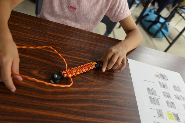 サバイバルバンドは、真ん中のプラスチックの部品に、コンパス、ホイッスル、スクレーパー、ファイヤースターターがついていて、編み込んで作るロープもほどけば使えるという優れものです。
