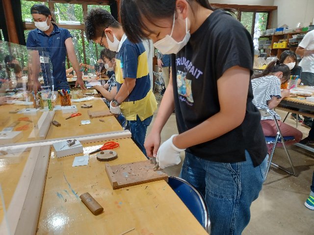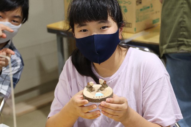 小刀の扱いに苦労していましたが、少しずつ上手に木を削ることができるようになった子どもたち。かわいいヒメネズミの工作を完成させて、お土産にすることができました。