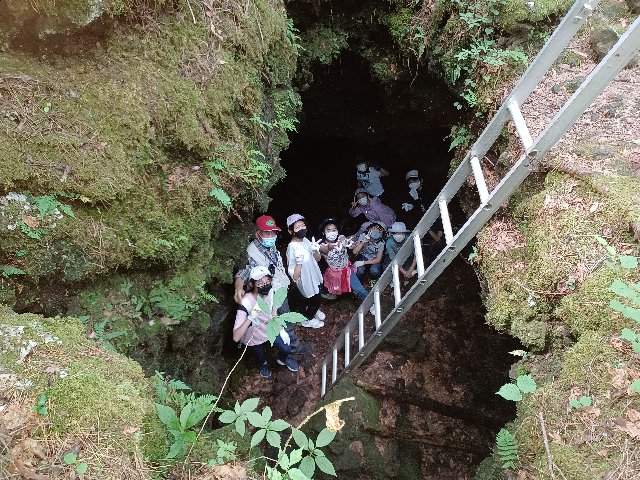 この場所は、青木ヶ原樹海とは違って、剣丸尾溶岩流の上にできた森です。樹海よりも薄く流れた溶岩がこの場所には、樹海のコウモリ穴のような溶岩ドームとしてできた洞窟でなく、溶岩樹形(溶岩が大木を燃やしたことによる大きさのやや小さい洞窟)が無数にあります。ここでは、その見学をしました。