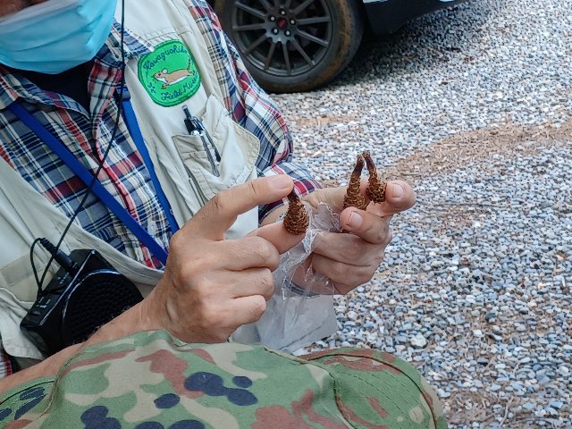 剣丸尾溶岩流の上の森の木々や生物の話も伺いました。松ぼっくりをリスが食べたあとの通称「森のエビフライ」も見せていただきました。