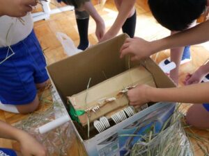 脱穀の仕方を調べた際、「先生、45000円の足踏み脱穀機を買って下さい!」と言ったのを私に断られ、「中古ならもっと安いです!」「ジモティーならただです!」とあの手この手で足踏み脱穀機を求めていたのですが叶わず、結果、「自分たちで作る!」と調べ始めました。段ボールで作ることができると分かると、材料を集め、ほとんど大人の手を借りずに作っていました。目指したのは、「手回し脱穀機」。ハンドルを回して脱穀をしていく機械を作っていたようで、数日かけて世界に1つの機械を作り出しました。子どもたち同士で工夫し合いながら、納得のいくものができたようです。休み時間に図工室で作業をしていた姿は、とても楽しそうでした。ちなみに、ばっちり回せる手回し脱穀機が完成しましたが、いざ脱穀となると「回すよりこっちの方が早い!」とほぼ回すことはなく・・・。ですが、一度にたくさん脱穀できるという良さを存分に生かして効率的に脱穀していました。
