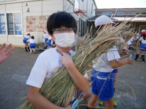 前半は、干している稲から、稲穂の部分を切り取りました。校庭で作業をしたのですが、あちこちに稲が飛んでいったり、上手く切ることができなかったりとなかなか大変でした。稲を腕にかけたり、ジャングルジムにかけたりするなど協力をしながら作業を進めていました。切り取った藁はバニラのご飯用にリアカーに載せていたのですが、「この長さじゃバニラ食べにくいから!」とはさみで短くする係もいつの間にか登場し、せっせとお仕事をしていました。きっとバニラも喜ぶことでしょう・・・。