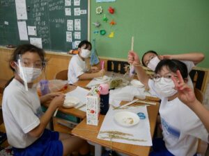 後半は、教室で村ごとに脱穀です。子どもたちが持ってきている道具を見てみると、牛乳パック・割り箸・櫛・おちゃわん、すり鉢などさまざま。「牛乳パックの方がやりやすい!」「いや、こっちの方が良いね。」と少々対抗意識を燃やしながら頑張っていました。1度で実が残らないように脱穀ができると気持ち良いようで、「先生、これ見て!」と残った藁を見せてくれました。