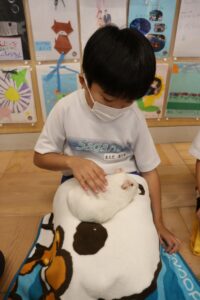 モルモットを飼育する上での大切なことを学び、ペットボトルを使って抱く練習をした後、実際に1人ずつ膝の上にのせてみました。