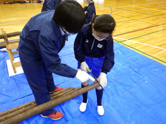 森林についての話を聞いた後、2チームに分かれて、「ドローン見学」「丸太切り体験」を交互に行いました。ドローンは今では林業には欠かせないもので、森林の様子を見る時に大活躍するそうです。実物を飛ばして、様子を伝えてくれました。丸太切り体験では、のこぎりを用いて、自分の力で切っていきました。木には節があり、そこに当たってしまうと大人の手でも簡単には切れないということを教わり、節をさけるように切っていきました。