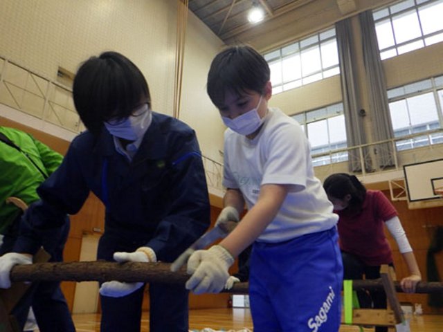 それでも大変な重労働だったようで、「先生~、疲れた。」「全然進まない・・・」といった声が聞こえました。最終的には私や講師の先生が手伝い、全員が無事に丸太を切ることができました。切った丸太はプレゼントしていただきました。さらに、丸太に付けてキーホルダーにできる道具もいただけたので、今日子どもたちに配りました。