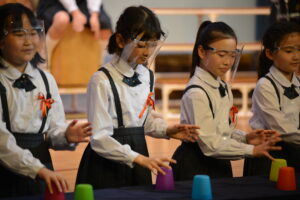 4年生では、CUPSを取り入れたリズム活動の発表です。CUPSとは、机の上に用意したプラスティックのコップだけを使い、曲に併せながら、コップや机を叩いたり、クラップ(拍手)を交えて奏でるリズム遊びです。速い動きもしっかりと息を合わせて、正確にリズムを奏でる4年生の子どもたち。素晴らしいがんばりでした。