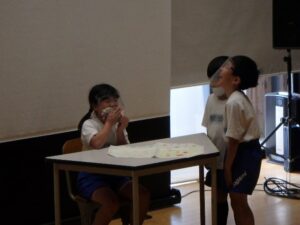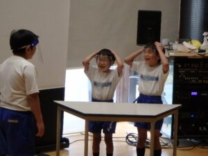 グループごとに自分たちで考えたシチュエーションを英語の会話を使って表現するスキットの発表。つい先日、音楽発表会でスイミーの音読をしたばかりの子どもたちではありますが、今回は日本語ではなく、英語なだけによりはっきりと伝えることが大切になります。