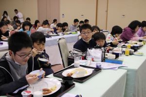 朝食は7時半から。ビュッフェ形式なので、子どもたちが食べたいものを食べたいだけ自分で用意していきます。