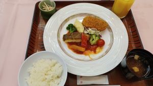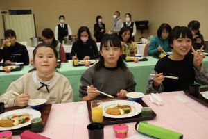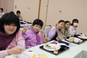 午後の練習を終え、子どもたちは入浴をしてから夕食をいただきます。今日のメニューは魚のソテーとカニクリームコロッケです。