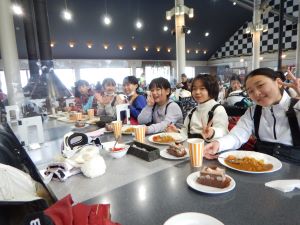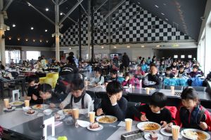 昼食はゲレンデにあるレストランでいただきました。メニューはカレーです。昼食にもデザートでチョコレートケーキがついていました。子どもたちのやる気につながります。