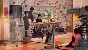 いよいよ、フジテレビの湾岸スタジオへ移動し、楽しみにしていた昼食のカレーを頂いた後、番組作りが始まりました。赤黄・白青のチームに分かれて、番組の前半と後半を分担して作ります。目の前には、普段目にする「めざましテレビ」そっくりのセットに、普段は見ることのできない、たくさんのカメラや機械。子どもたちも私もびっくりしてしまいました。