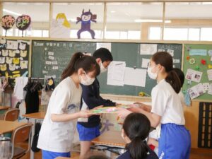 「6年生を送る会」は残念ながら中止となってしまいましたが、例年製作している縦割りでのプレゼント作りは無事に行うことができました。プレゼント係の子たちが中心となってアイデアを出し合い、今年度は花束の形でメッセージを送ることとしました。