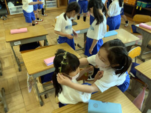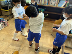その後、私の方から「ヤエムグラ」という野草を紹介しました。この野草は、服にくっつく特徴があり、よく「ひっつき虫」などと呼ばれるものです。全員に渡すと「なんで~?」「不思議。」「なんかざらざらしてる。」と様々なことを口にしながらも、友だちとくっつけ合いを楽しんでいました。くっつけ合いは、それだけで1時間授業ができてしまうのではないかと思うくらい盛り上がりました。「草花って、面白い!」そう感じられた一幕でした。