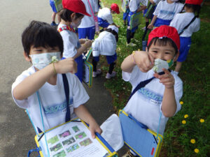その後は外に出て、学園の畑の方まで春探しに行きました。タンポポとニセタンポポ(ブタナ)のちがいを確認して、本物のタンポポの葉を探しました。そっくりだけど、触るとちがいがよくわかります。バニラが好きなのは、タンポポ。ブタナはタンポポにそっくりですが、ザラザラもさもさしていて苦手なようです。途中に生えていたシロツメクサは、引っ張りっこをして遊びました。他にもカラスノエンドウやスイバ、ヘビイチゴ、ヨモギなどを探して、春と触れあいました。
