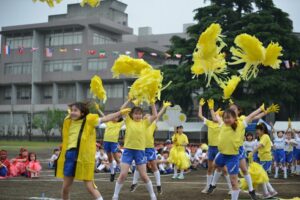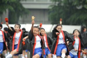 小学部の運動会のメイン種目である全校演技は、鳴子を使った演技です。高学年のパートは、3年ぶりの「よさこいソーラン」、低学年から始まり全校で踊る後半部分は、YOASOBIの「群青」に併せた体育科教員のオリジナルのダンスです。コロナ感染防止の観点から、午前中を低学年保護者へ、午後を高学年保護者への公開にして行われた2回の全校演技でしたが、どちらも雨の中でのスタートでありながら、終わりを迎えると雨が上がりました。子どもたちのパワーが雨を遠ざけたようでした。特に、午後の部の発表では、踊り終えた6年生から涙があふれ、見ている保護者、教職員の涙も誘って感動的な運動会となりました。