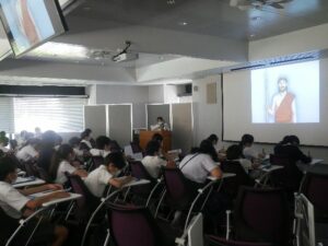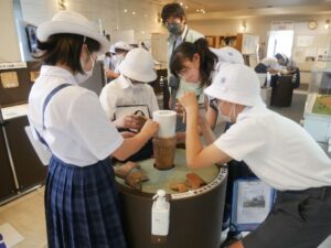 最初に縄文のくらしについての映像を見せて頂きました。旧石器時代から縄文時代への流れや、縄文土器が出てきたことで生活ががらりと変化したこと、縄文時代の食生活など詳しく解説された映像で、子どもたちはしっかりとメモをとっていました。