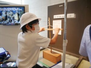 火起こし体験では、火は出ないものの一生懸命に動かすと熱くなることもあると聞き、説明を見ながら挑戦する子がたくさんいました。最初は上手くできないようでしたが、何度かやっていくうちに、「先生!できた!熱くなったよ!」と嬉しそうな声が挙がり始めました。土器のパズルは、出土したときのようなバラバラになっている状態の土器を、元の形に戻すというパズルでした。ピースは大きめなのですが、これがなかなか難しく、子どもたちも「こっち?いや、違う、こっち?」と試行錯誤しながら挑戦しました。