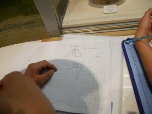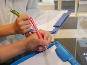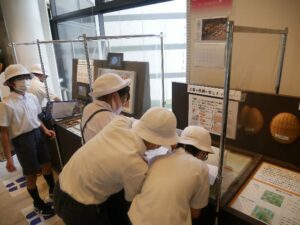 「縄文土器」と言っても、前期のものと後期のものでは模様の付き方や形の複雑さが違ったり、さまざまな土偶が発掘されていたり・・・展示してあるものを見て、「自分の家の近くからこんなものが出ているんだ!」と驚いている子もいました。しおりを片手に一生懸命に何やら書きこんでいる子どもたちの手元を見ると、展示品のスケッチをしている子がたくさん。「珍しいから、書いて残したい!」「時代ごとに順番に書いているんだ。」と得意げに見せてくれました。