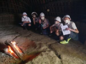 お昼ご飯を食べた庭園には、復元された竪穴住居が3つたっています。遺跡庭園「縄文の村」と名前がついているように、ここは正真正銘の遺跡です。多摩ニュータウンNO.57遺跡を盛り土にして、当時の景観を復元したものだそうで、竪穴住居だけでなく、周りにある植物も縄文時代にあったとされる植物が植えられていました。今まで絵や写真でしか見たことのなかった竪穴住居に、子どもたちも大興奮。特に、中で火を炊いている竪穴住居では、より暮らしの様子を体感することができました。