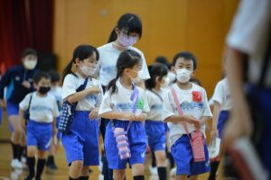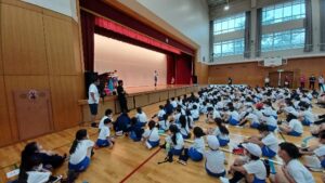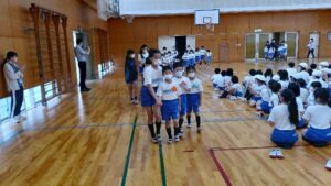 体育館の舞台で縦割りチームと名前を紹介されましたが、大きな声で「はい!」と返事をしていた子が多くいました。チームに合流する時は、6年生に連れられ、その後5年生が一緒に並んでくれました。