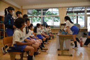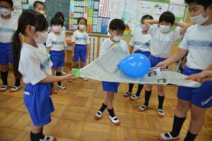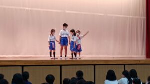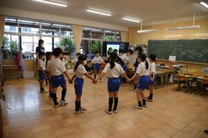 例えば、フラフープゲームでは、みんなで輪になって、手をつないだままフラフープを一周させるという、みんなで協力して達成する喜びを感じ取れるゲームです。異学年で協力する楽しい時間でした。一年生は特に楽しかったようで、「もっとやりたい!」「もう時間になっちゃった。」という声が、教室に戻ってからも盛り上がっていました。