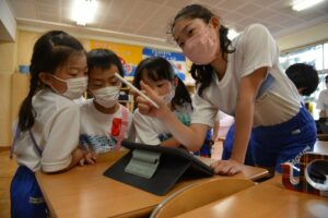 例年であれば、縦割りチームごとにご飯を食べたり、お昼休みを過ごしたりするのですが、コロナの予防もあり、今年は見送られました。それでも、その後のお掃除はやる気満々で、上級生に仕事を教わりながら、一生懸命にお掃除をしている姿が印象的でした。