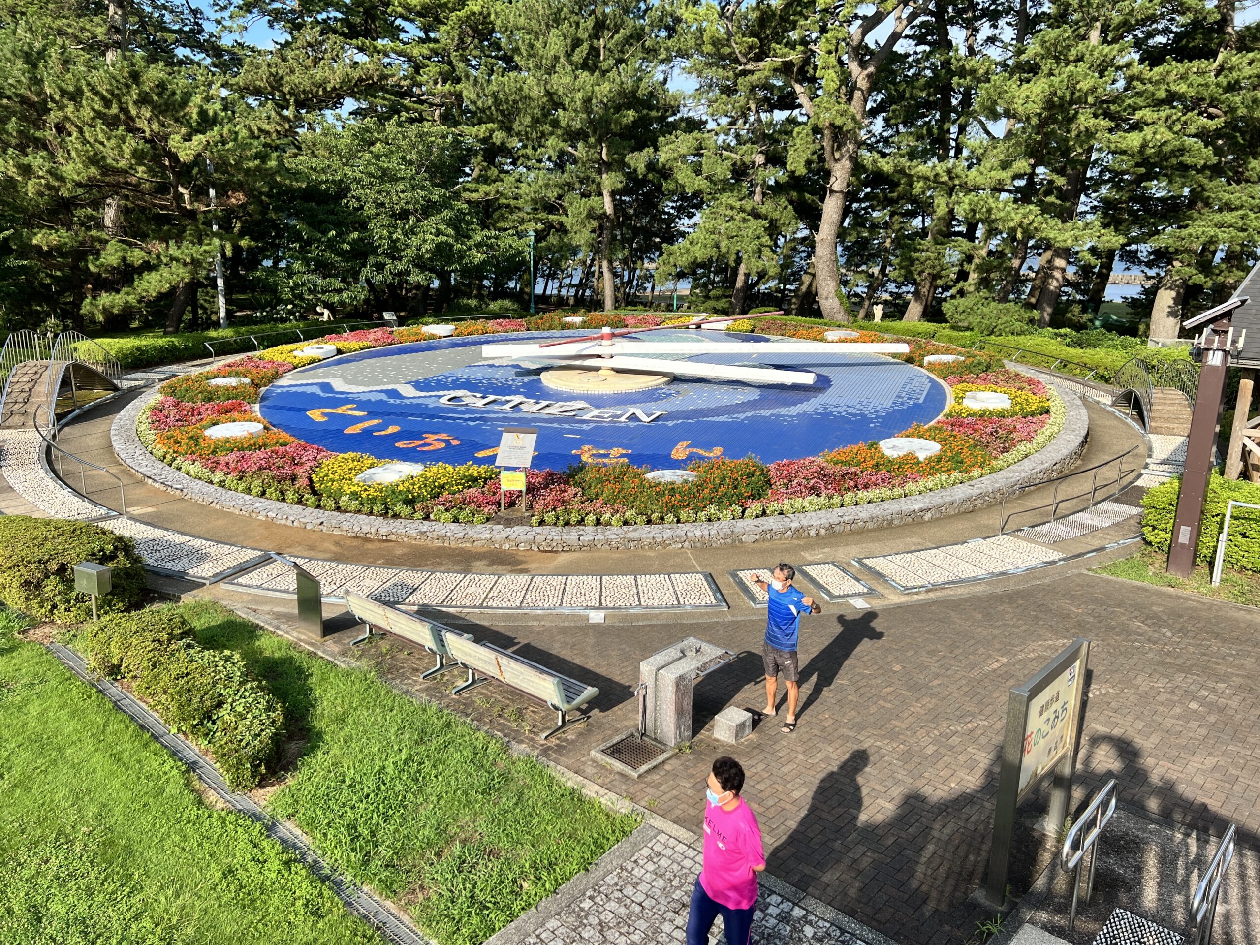 平成3年に世界一の花時計ということでギネスブックに登録されている、立派な花時計の前に並んで、集合写真を撮りました。