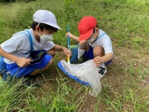 そこで、総合の授業では、秋探し探検として木の実採集チームと虫を採集するチームにわかれて、学園の探検に行きました。