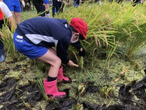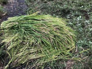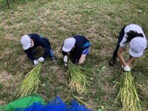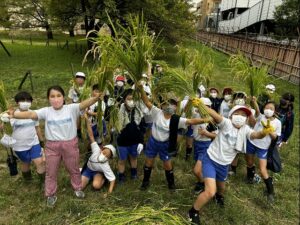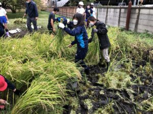 「刈ったあとは、どうするのかな?」と質問すると子どもたちからは「食べる!!」との答え。「脱穀」や「精米」という意識はほとんどないようです。収穫したあと、何をすべきかを少し学んでからみんなで「食べられる」ように計画していきたいと考えています。