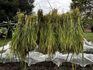 刈ったあと、稲穂を干すために、束にまとめるのですが、麻ひもでかた結びをするのが難しく、「結べた~!」と、見せてくれるのですが、ゆるくてバラバラと稲が落ちてくる・・・なんてことも多々ありました。