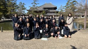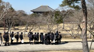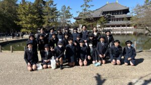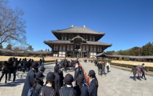 京都駅到着後、バスに乗り換えて、奈良まで移動しました。昼食後、東大寺を見学しました。