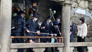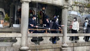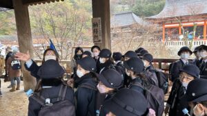 その後、清水寺にバスで移動しました。改修工事が終わったので、きれいになっていました。山門、舞台がある本堂、音羽の滝などを見学しました。
