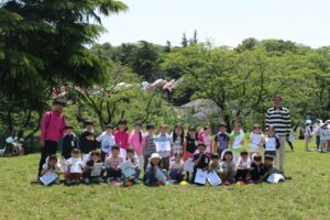 当日の朝は、真っ青な空の下で、緑の野原が広がる自由広場に集合しました。爽やかな春風が吹いてとても気持ちよく、最高の遠足日和でした。