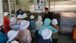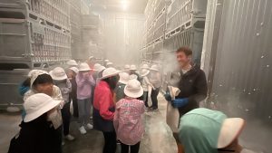 -60度の冷凍庫に入ります。新鮮さを保つための-60度の冷凍庫体験に、子どもたちは大興奮。また、加工会社の方でも、-60度の中での活動は、長時間できないとの話を聞いて、おどろいていた子どもたちでした。
