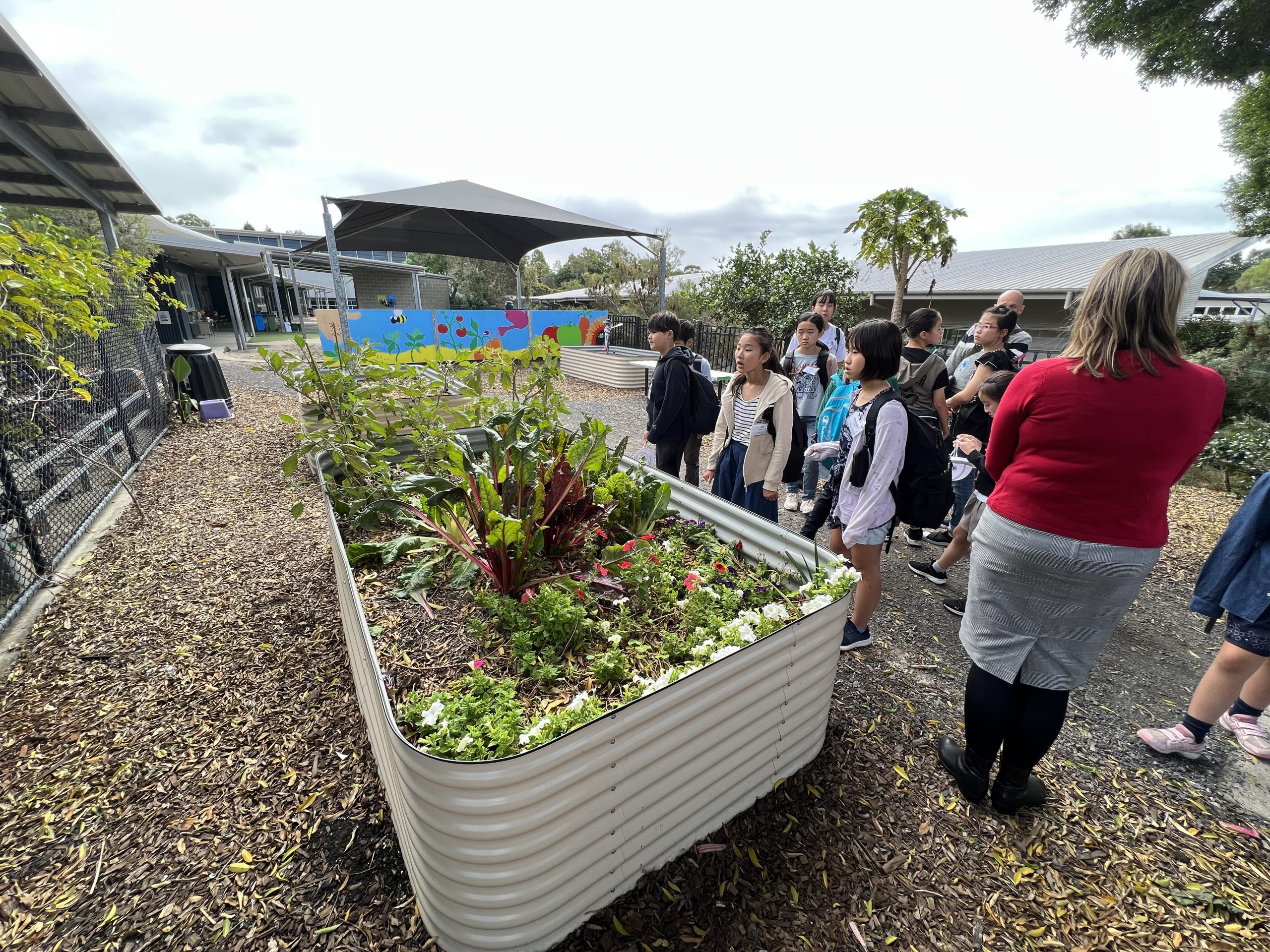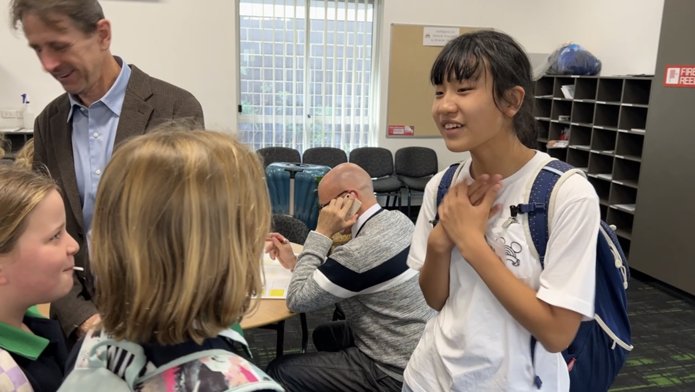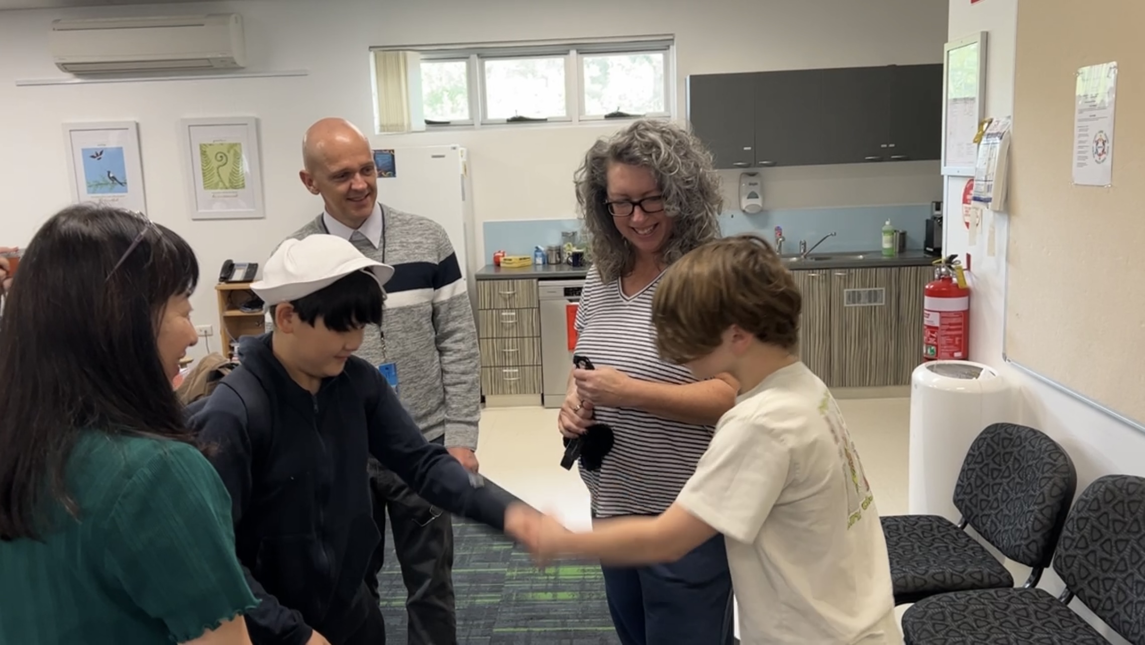 PSSSの代表児童に校内を案内してもらいました。PSSSは相模の校舎とは違い、学年ごとに建物が分かれていました。相模の子どもたちが過ごすことになる5・6年生の建物や図書館、菜園などを見学しました。見学が終わったら、下校時刻である14:40が近づいてきました。いよいよホストファミリーと対面するため、スタッフルーム(職員室)に移動しました。