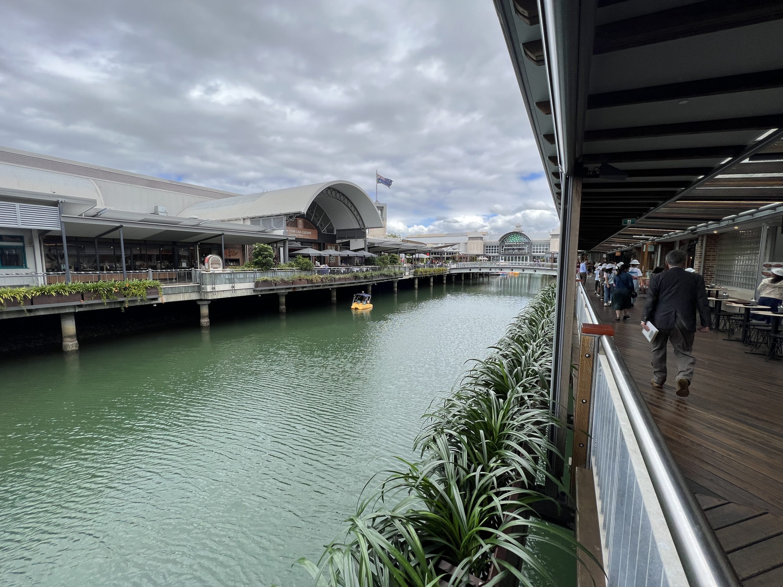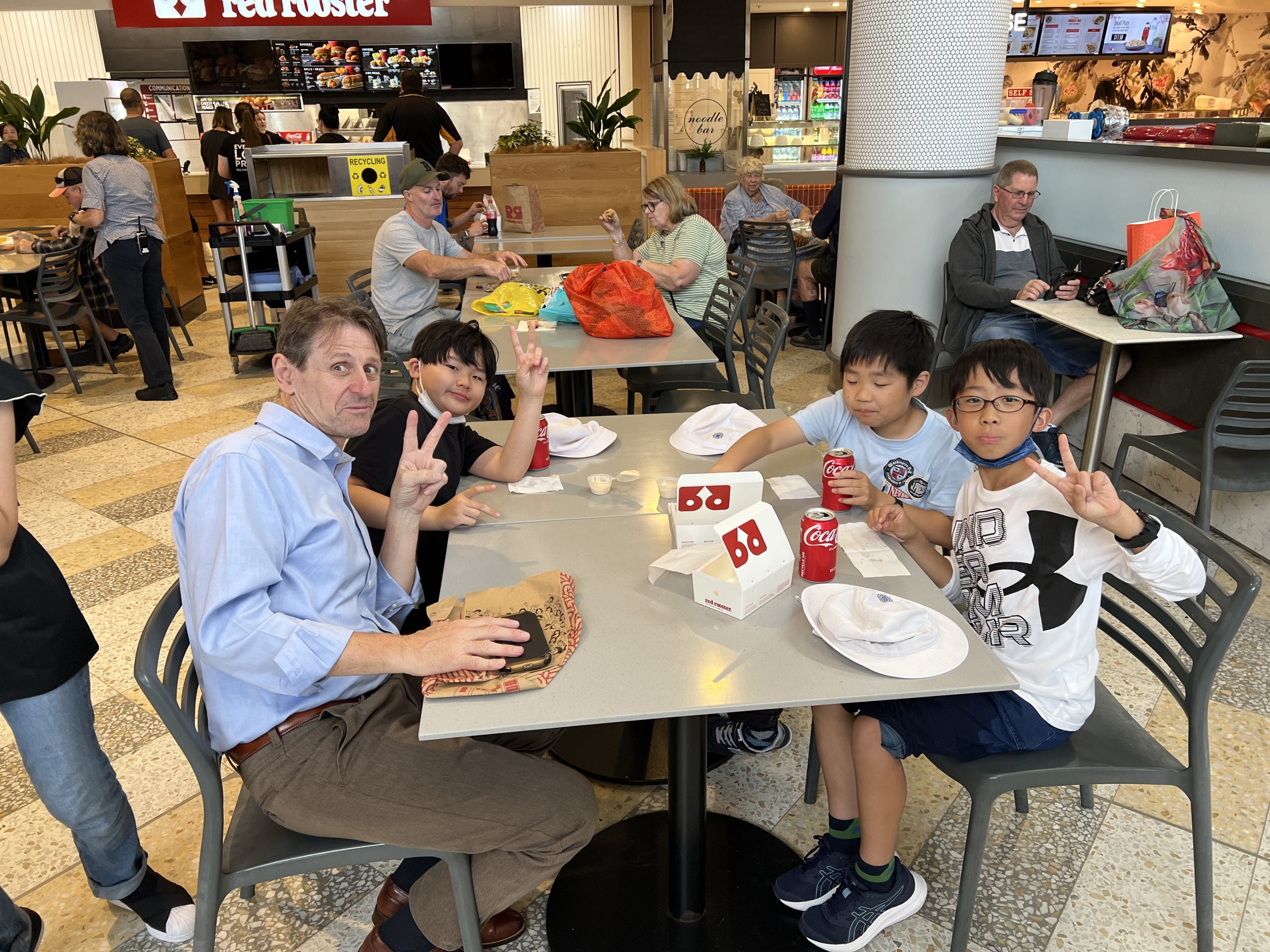 サンシャインコーストにある、ムールーラバビーチに行って足だけ海に入って遊びました。波打ち際で遊んで、大分リラックスできた子どもたち。昼食を取るため、今度はマルーチドアのショッピングモールに向かいました。