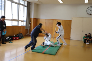 警備会社のプロを招いて、学校に不審者が凶器をもって侵入してきたことを想定した、教員の実技研修会が開かれました。