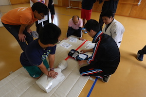 私たちが事故現場に遭遇したり、家族が緊急事態になってしまう確率はゼロではありあません。意識がなく、呼吸をしていない人に対して、救急車が到着するまでの間、いつでも手が尽くせるようにしておきたいものです。小学部のAEDは体育館ロビーと新たに職員玄関に設置されています。