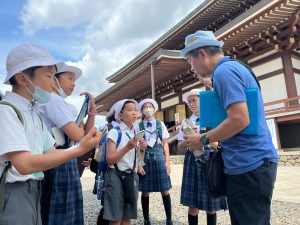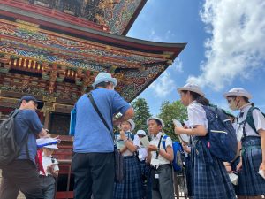 初日は、成田山新勝寺での見学と取材活動です。広い成田山新勝寺の歴史や言い伝え、様々な建物の特徴や施された彫刻などの話について熱心に取材しました。