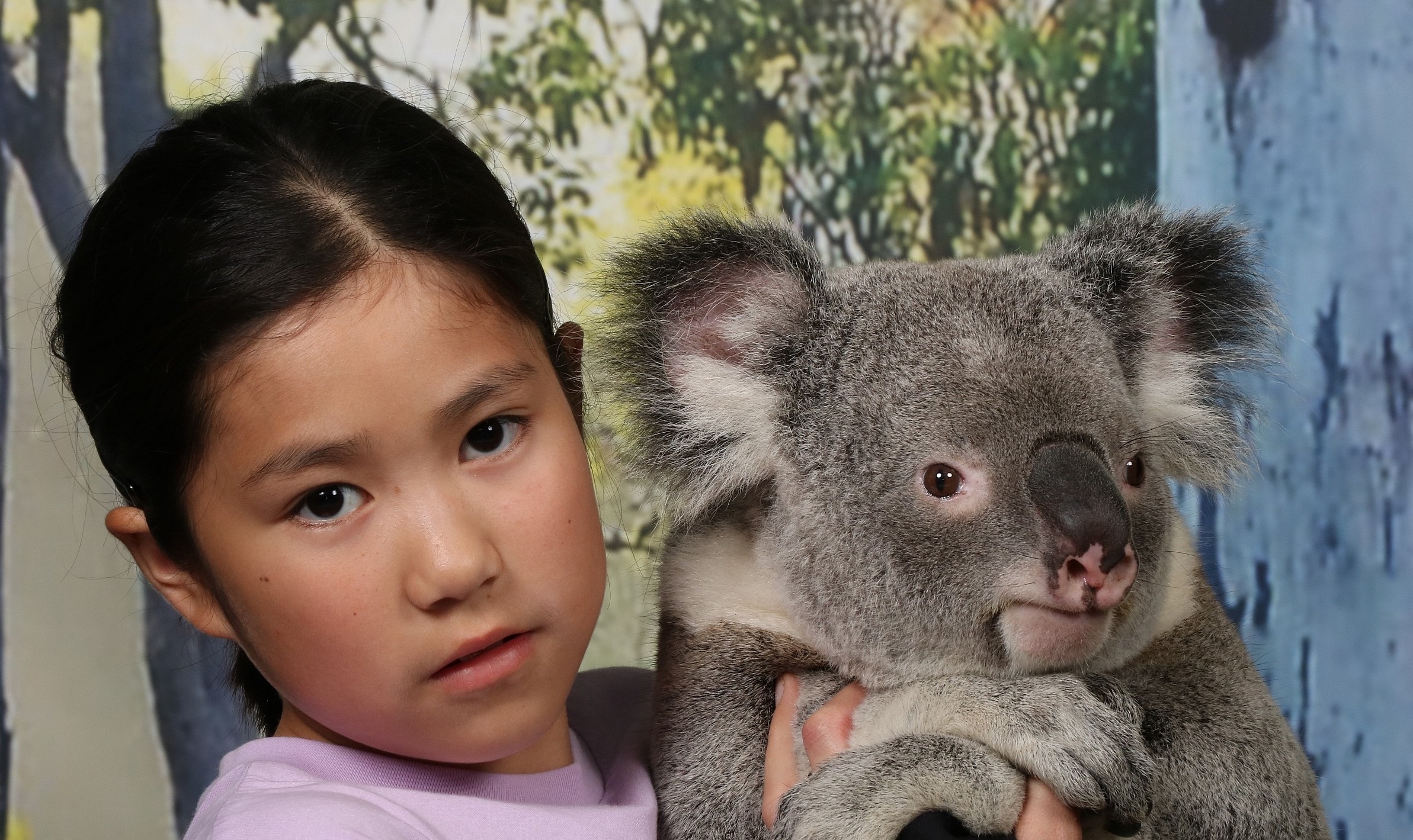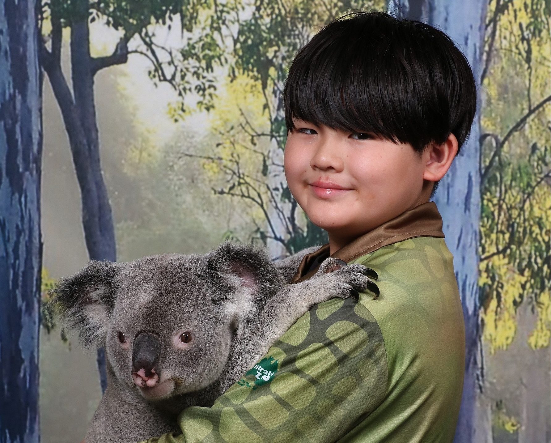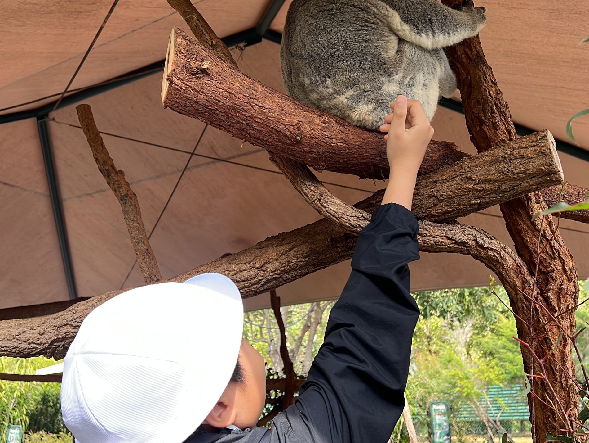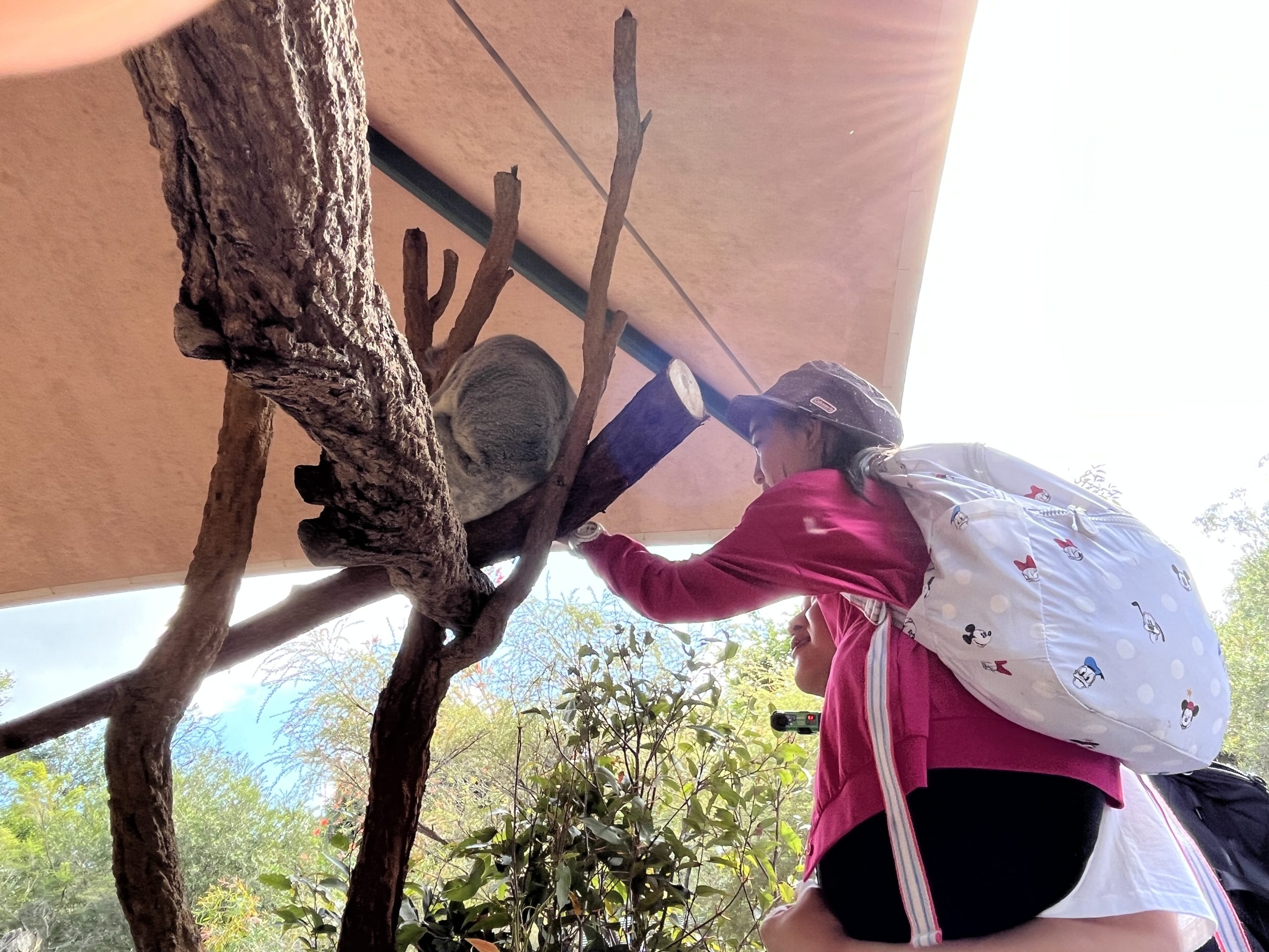 お土産を買った後は、今回のハイライトともいうべき、コアラの抱っこ体験です。実際にコアラを抱っこして写真を撮ることができるのですが、コアラを抱っこするのは中々大変でした。コアラがしがみついた時に安定感があるように、自分が木になったつもりでしっかり立つことが大切です。また、コアラも気まぐれなので、何度が落ち着くまでやり直しながら撮影しました。可愛かったよりも先に出てきたのは「意外と爪が鋭くて痛かった!」「ユーカリの匂いがした!」といった感想でした。でも、コアラを抱っこできてとても嬉しそうでした。