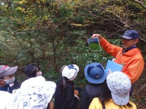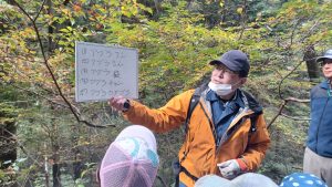 森の散策は、学年を6つのチームに分けて行いました。関東森林管理局のみなさんが、それぞれのチームについてくださり、森を散策しながら、植物や動物、昆虫などの話を伺って学びを深めました。