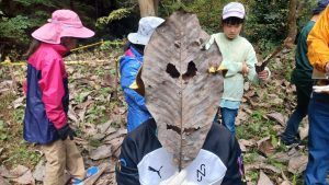 例えば、葉っぱのにおいを嗅いだり、線香の原料である杉の木の葉っぱに火をつけて煙のにおいを感じたり、大きなホオノキの葉っぱを使ってお面を作ったりしながら、楽しく見学をしました。途中、イノシイが掘った地面や安全のために備えられたスズメバチの女王蜂をつかまえるトラップなども見ることができました。