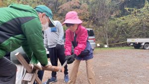 午後は、丸太切り体験と森林の役割をスライドを通して学習する2つの活動を行いました。