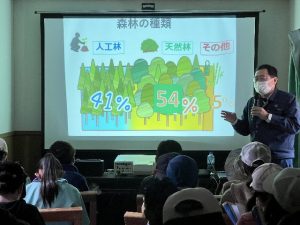 スライドを利用しての学習では、地球温暖化を防ぐためには森が欠かせないことや、森を守っていくことの大切さと森を整備する仕事とは、どのような仕事であるのかを学びました。