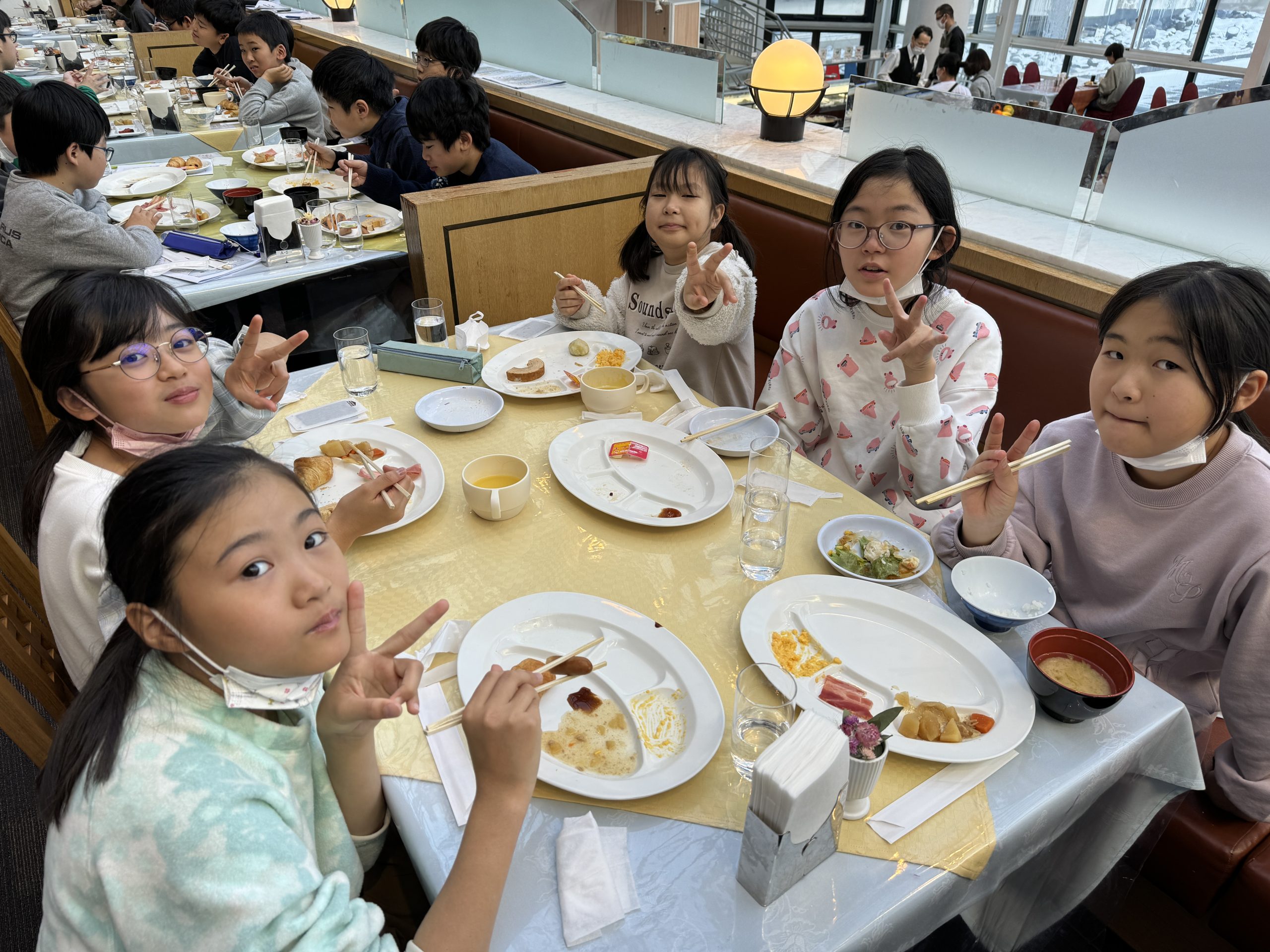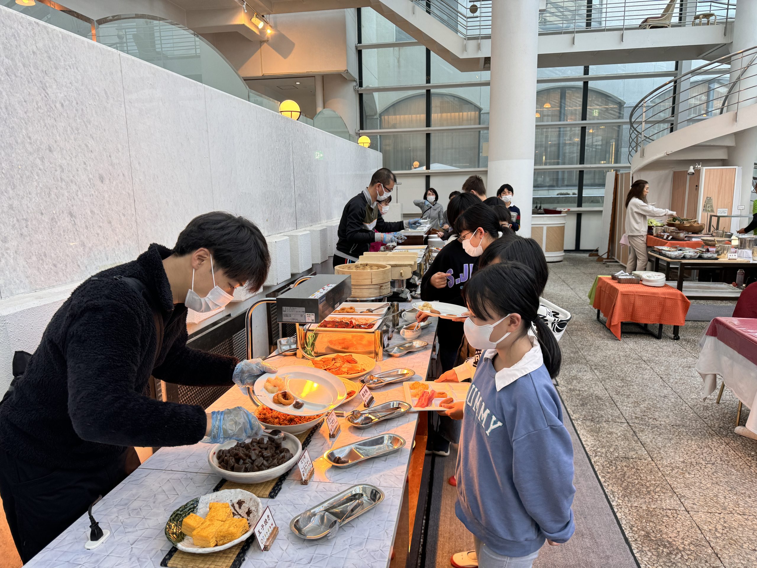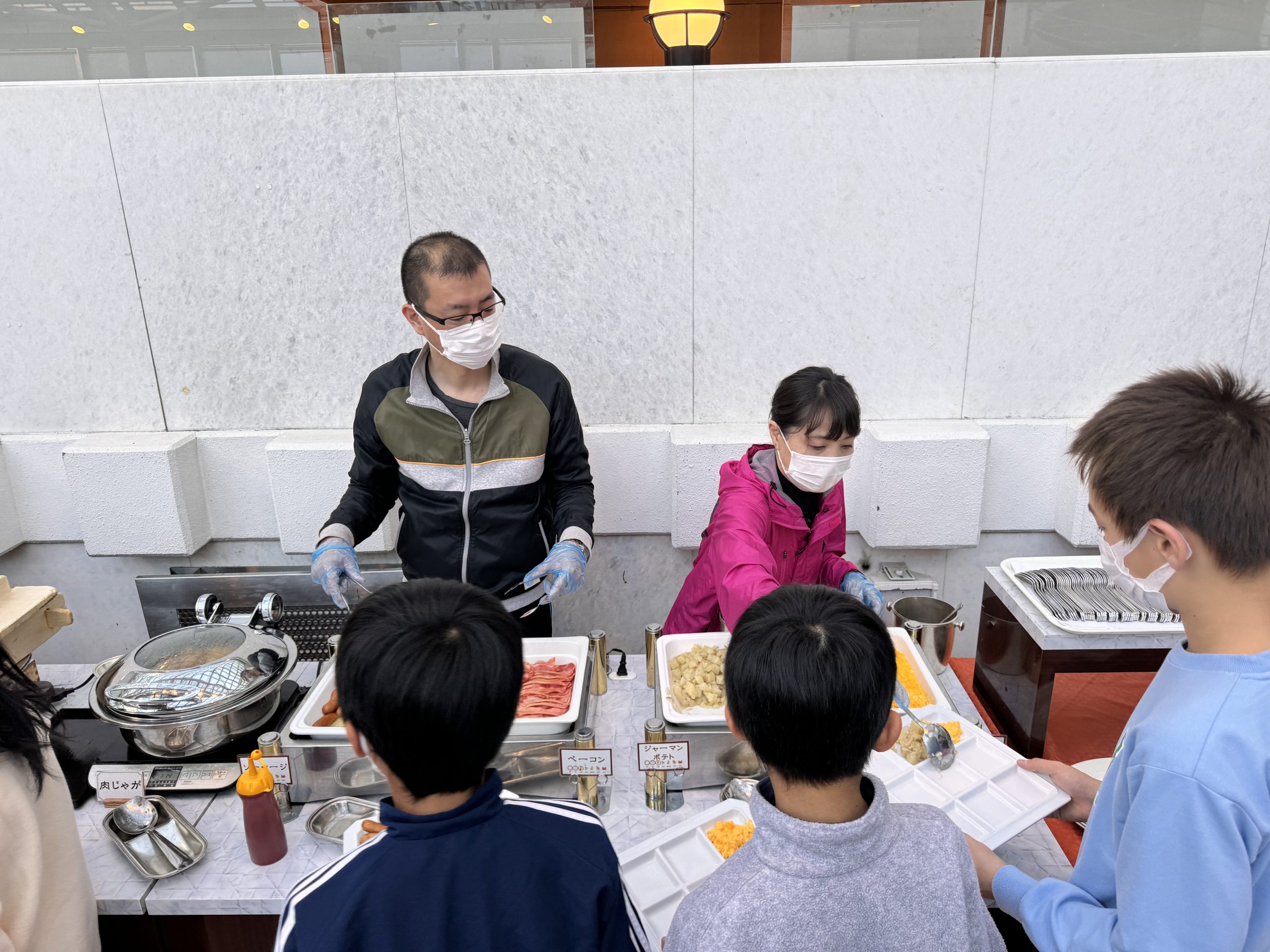 今日の朝食はビュッフェ形式です。自分で食べたいものを選んで、先生たちが取り分けてくれました。たくさん食べて、1日の練習に備えます。