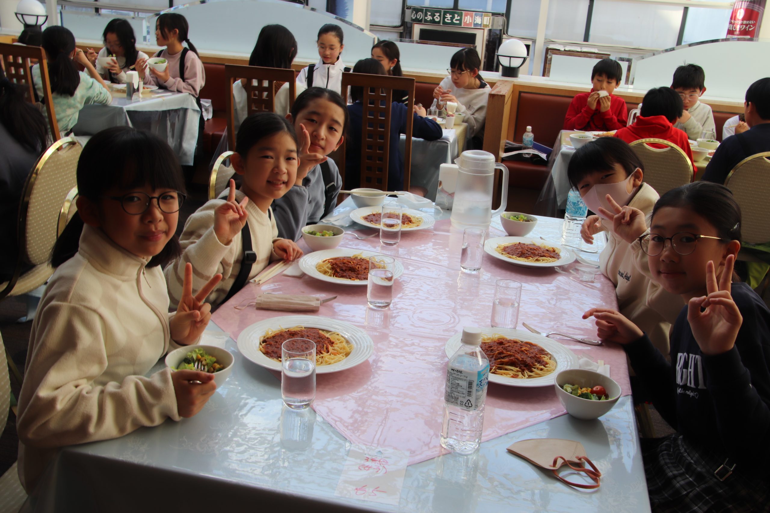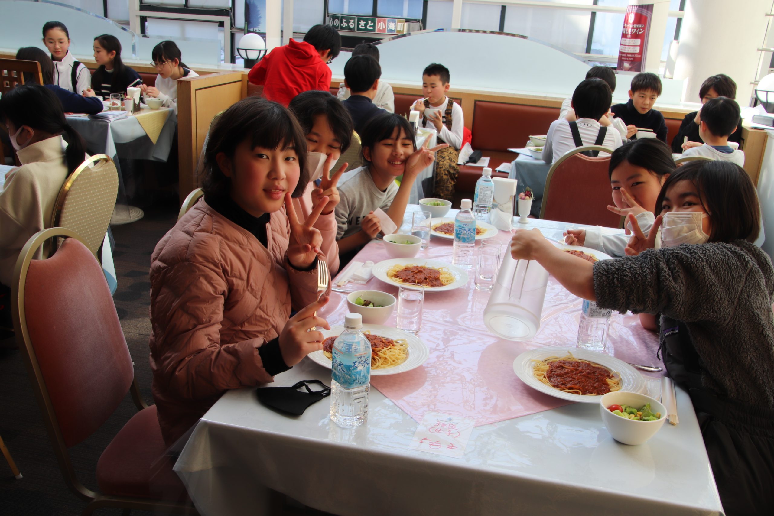昼食はミートソーススパゲッティです。スキーの練習はとても体力を使うので、とてもお腹が空いていました。たくさん食べて午後の練習に備えます。