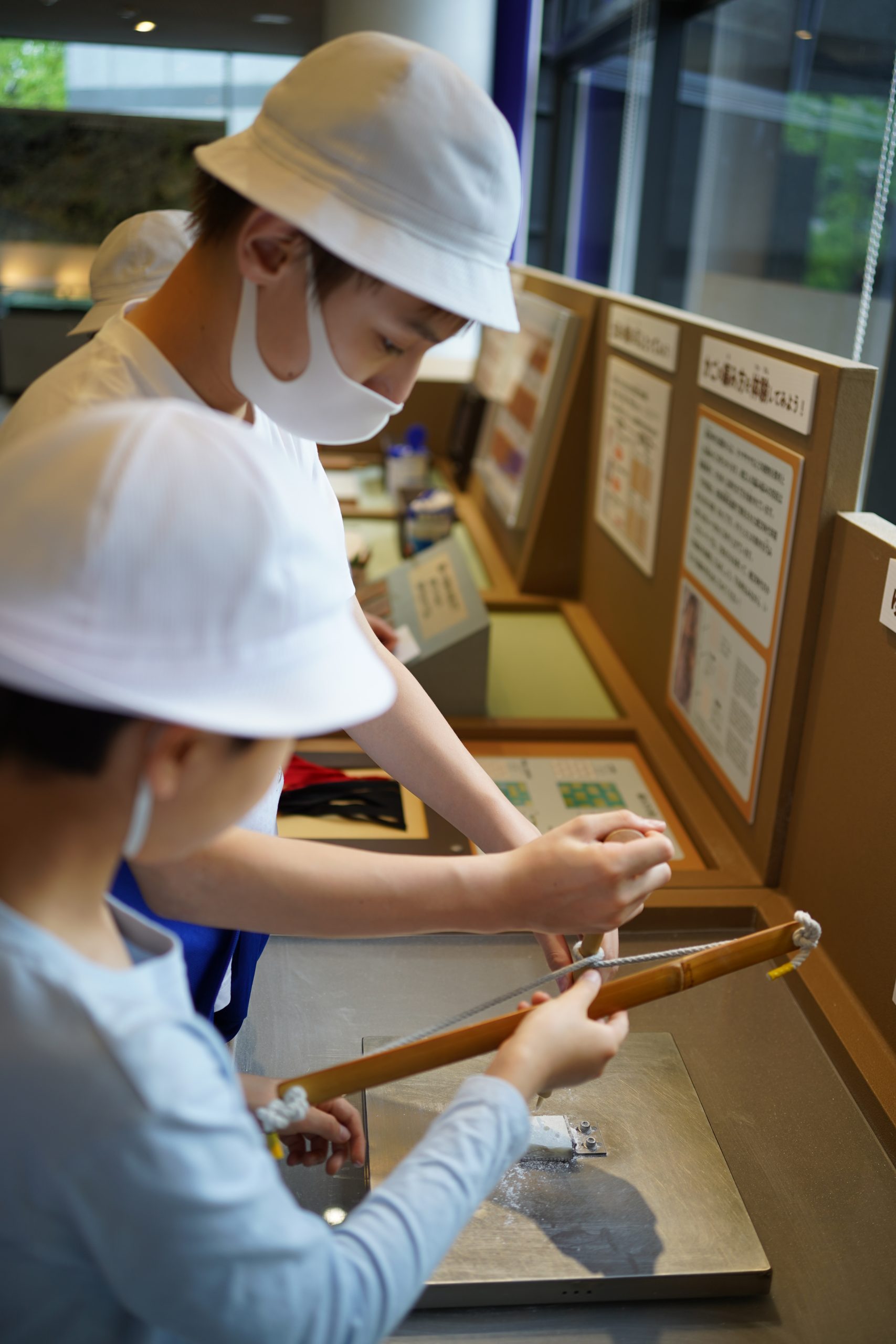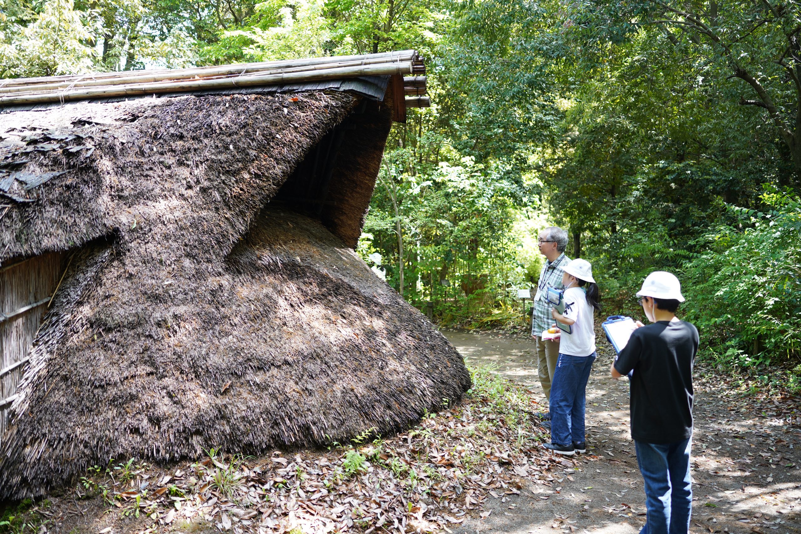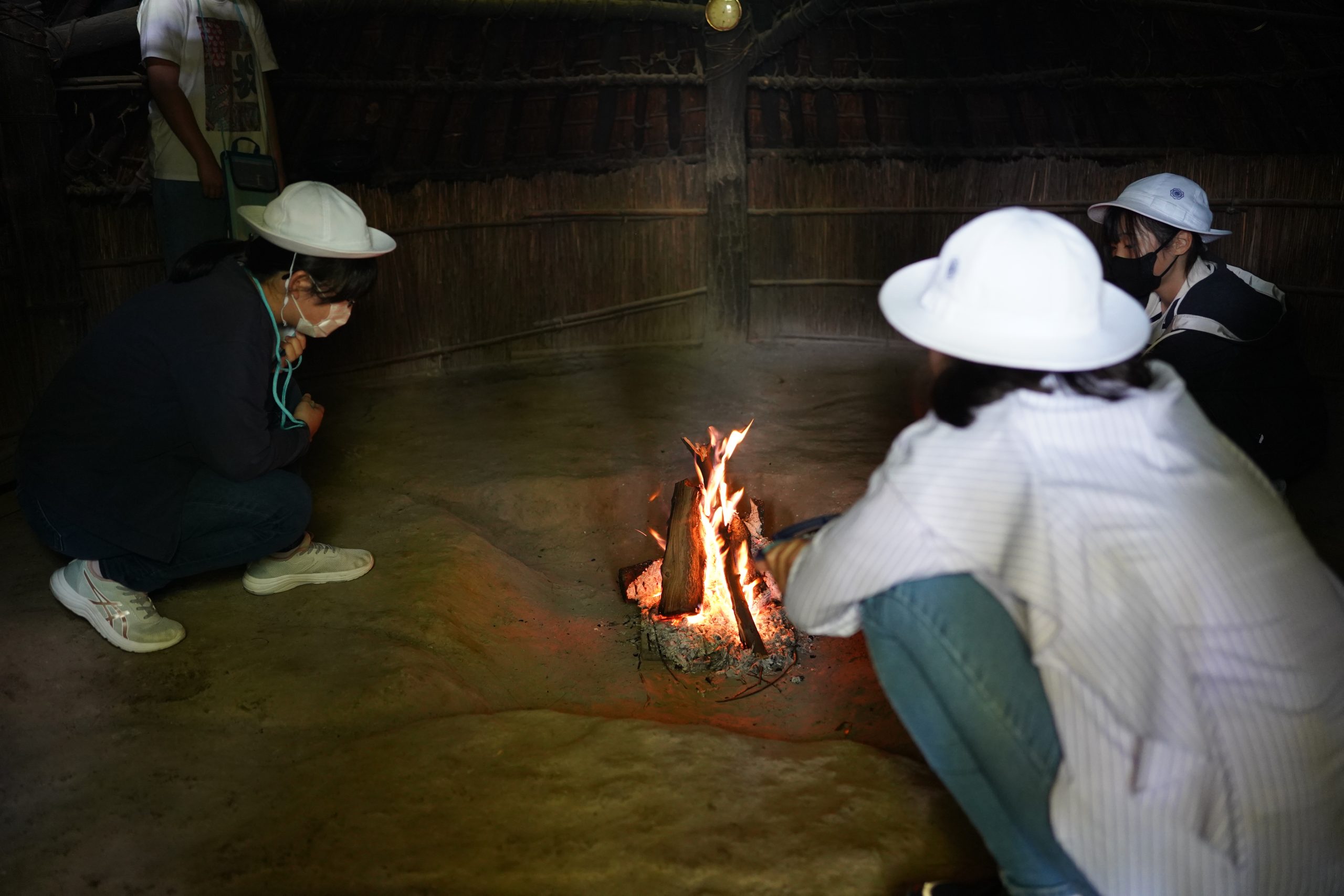 庭園では、竪穴住居が置かれていたり、実際に縄文時代に生えていた草花が生えていたりと、縄文の村が再現されています。「こんなところで寝たら、背中が痛くなっちゃうよ、マットレスが欲しい〜。」「縄文時代にはそんなの無いよ!」「この広さで4人の家なの?結構な豪邸だねえ。」と言いながら、竪穴住居の中に入りました。案内してくださった係の方に、「これは、何でできているんですか?」と積極的に質問する子もいました。竪穴住居の中で火を炊いてくださっていたところもあり、「こんな感じだったのかな〜。」と、焚き火をするような配置で座ってみた子もいました。