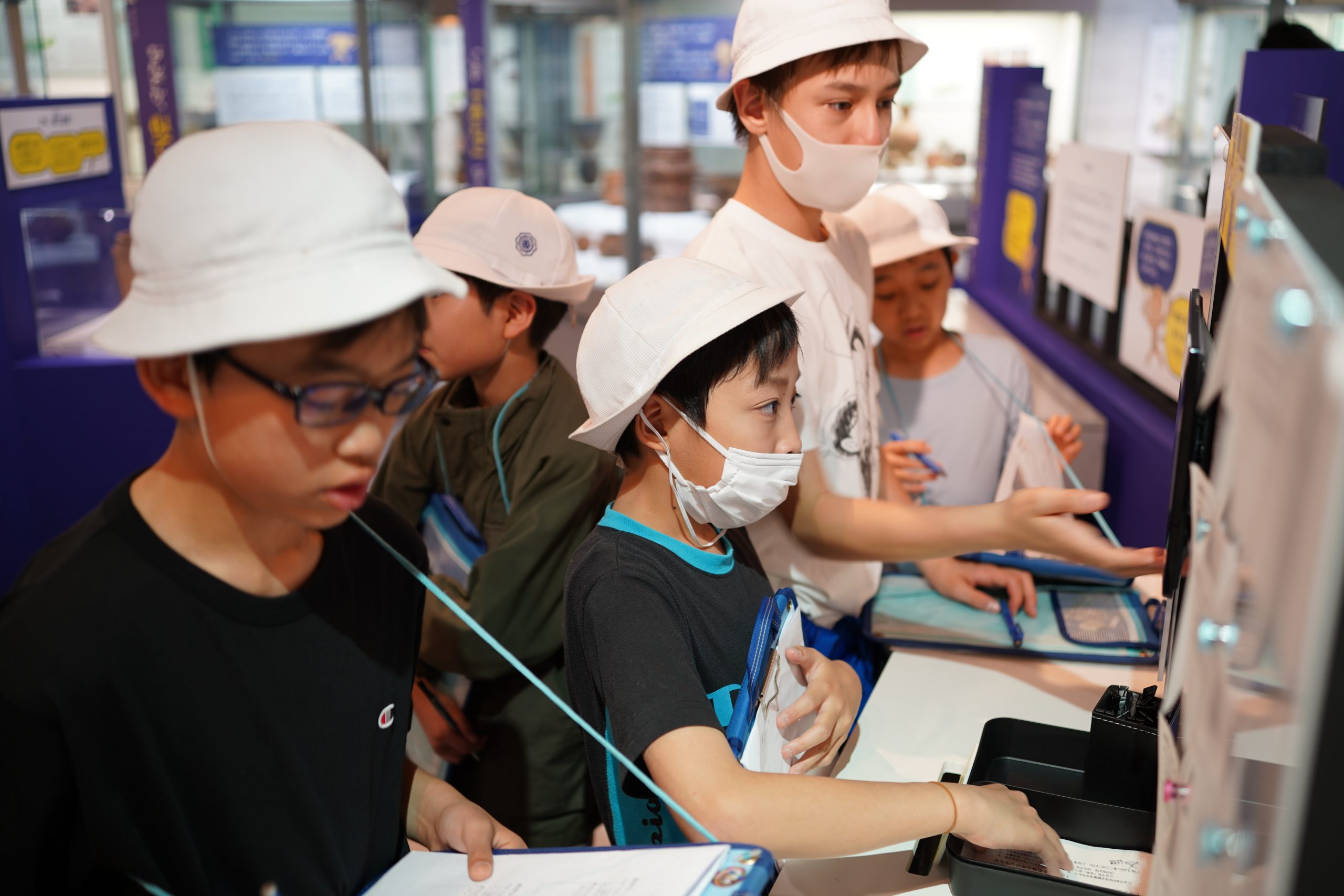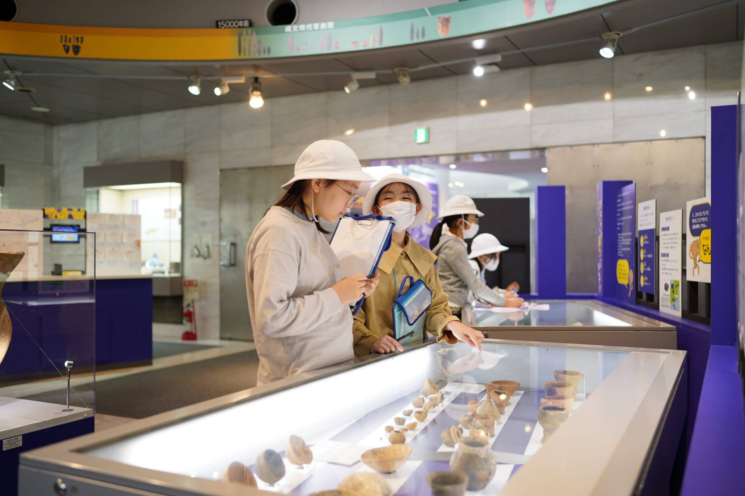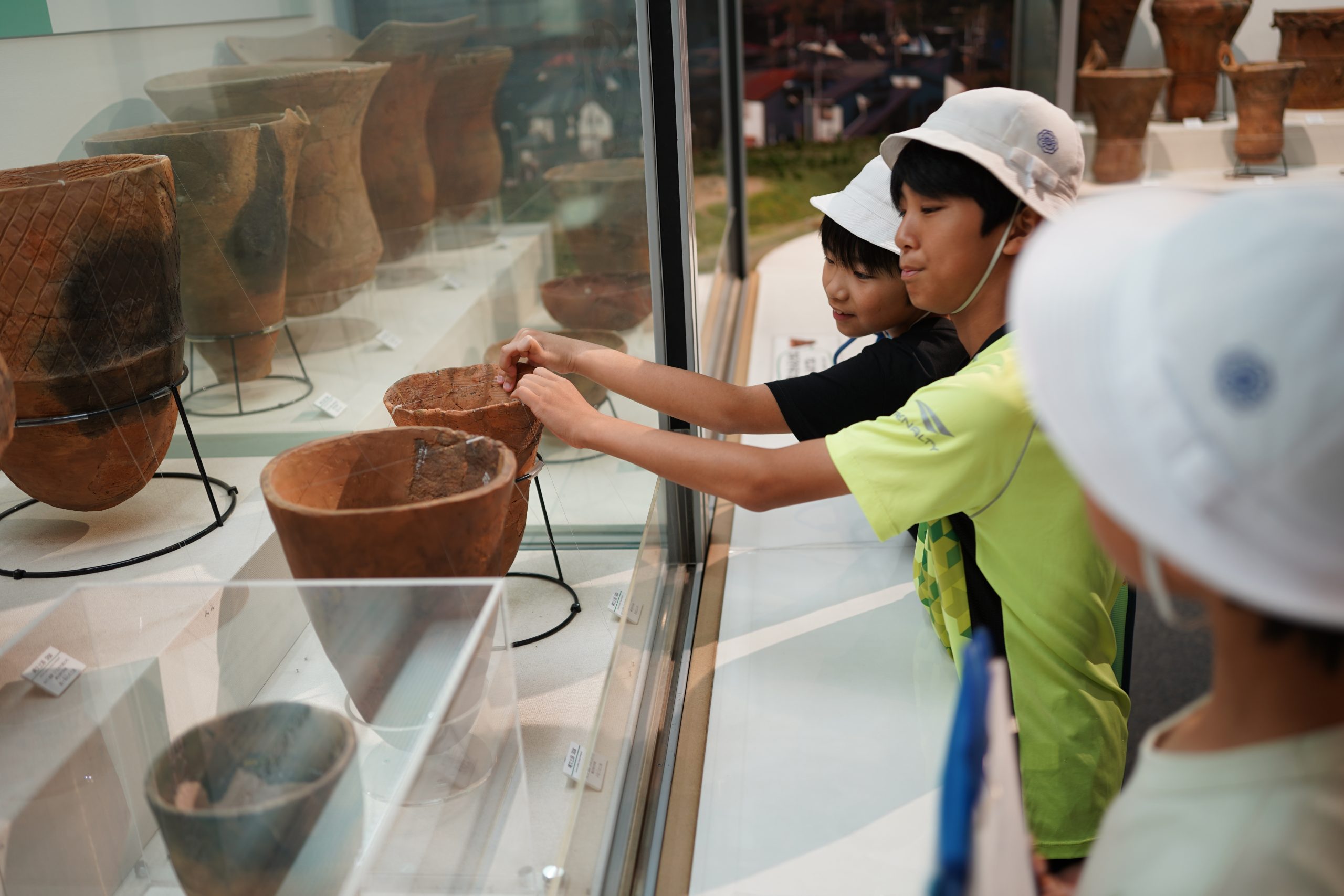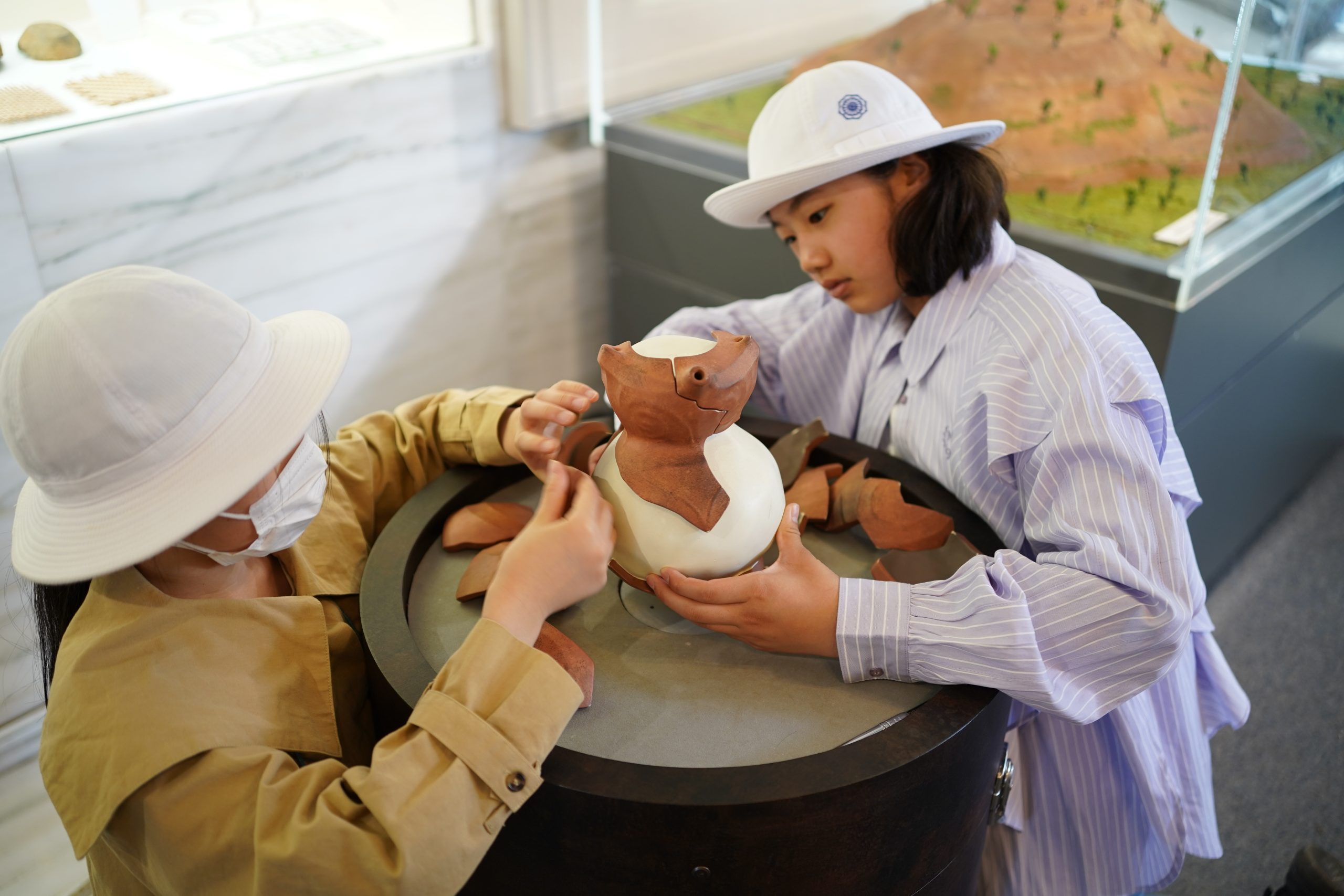 展示ホールでは、実際に出土した土器も触ることができたり、実際にイノシシを採っていた穴と同じ大きさを再現したものにすっぽりと入ってみたりと、興味津々でした。特に今回、企画展として開催されている「多摩のなんで!?な出土品」という展示では、出土されたものの中で、専門家の方でも「なんで?」と思うような形の出土品について、その理由をそれぞれの発想で考え、シェアする企画が行われていました。謎のポーズの人(?)が書かれた土器、何に使うかわからない穴が沢山開いている器、自立しない土器・・・確かに「なんで?」と思うものが沢山ありました。探究のように答えの無い発想のシェアに、子どもたちも楽しみながら縄文時代の出土品に思いを馳せました。